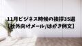 時候の挨拶 11月ビジネス時候の挨拶35選【社外向けメール/はがき例文】 11月の時候の挨拶35選。社外向けメール・はがきですぐ使える書き出し例と、上旬/中旬/下旬の使い分けを丁寧に解説。立冬・晩秋・向寒など季節に合う表現がわかる。 時候の挨拶